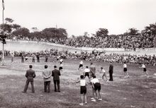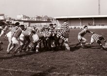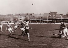 Een rugbywedstrijd op het A.S.O. terrein (Association Sportive Ostendaise).Op de achtergrond de L. Van Tyghemlaan.