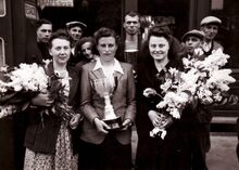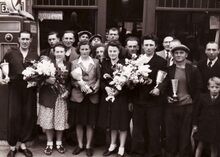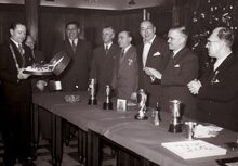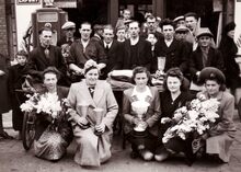 De winnaars van een wielerkoers voor dagbladventers.Hun dames zitten vooraan met de trofeëen en de bloemen.