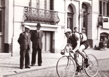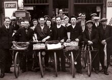 De winnaars van een wielerwedstrijd voor dagbladventers (op hun "werkpaarden") voor hun lokaal.