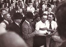 Centraal de gekende Franse renner Jacques ANQUETIL,links burgemeester Adolf VAN GLABBEKE met een winnaar van een wielerwedstrijd te Oostende.