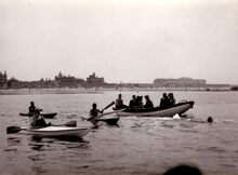 Zwemwedstrijd in zee,de Oostendebankrace.Op de achtergrond ziet men duidelijk de vernielingen van wereldoorlog II op de Zeedijk,de badinstellingen ter hoogte van de Kemmelbergstraat.