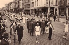 Alfons Pieterslaan, hoek Kannunik Dr. Louis Colensstraat, handelszaak "Huis Kalter". Optocht van de turnvereniging OTV, Noordzee bij de huldiging van Arthur Defer. De luifel op de achtergrond rechts is die van de Biercoo. Vooraan links in turnkledij, Louis Claeys