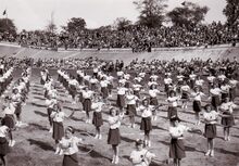 Een afdeling meisjes en dames van turnvereniging K.V.G.O. = (Koninklijk Vanneste Genootschap Oostende).