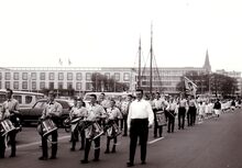 Optocht van de turnvereniging "Willen is Kunnen" met muziek en vlag langs de Vindictivelaan nabij het Tweede Handelsdok. Op de achtergrond, het Stadhuis.