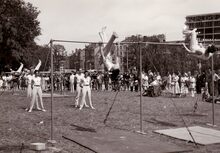 Turndemonstratie op het Canadaplein.Links het Leopoldpark,rechts Hendrik Serruyslaan.