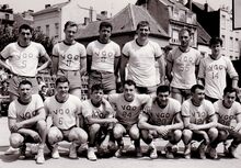 Formaat : 13 x 18 cm. - De basketploeg van K.V.G.O. (Koninklijk Vanneste Genootschap) die toen op het Mijnplein speelde in eerste nationale in 1963. Staande van links naar rechts : Paul Weenen, Robert Jolyt, Maurice Chavagne, Lucien Van Kerschaever, Piet Van Huele, Willy Klaassen. Gehurkt, van links naar rechts : Jules Boels, Raymond Van den Kieboom, Freddy Deckmyn, John Bourgoignie, Charlie Zonnekeyn, Guy Campana, Clement Vanherpe.