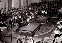 Zicht op een zaal in het Feest- en Kultuurpaleis tijdens het Europees kampioenschap biljart.Winnaar in het kader 71-2 was de belg Laurent Boulanger.