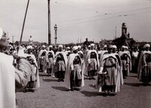 Franse officieren van de Spahis (Noord Afrikaanse ruiters in dienst bij het Frans leger) verlaten het Gerechtshof, toen dienstdoend alsΒ stadhuis, aan het Canadaplein na een ontvangst door het stadsbestuur ter gelegenheid van het bezoek van deze militairenΒ aan de stad.
