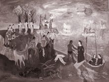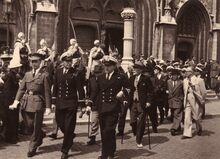 Het Te Deum naar aanleding van onze nationale feestdagΒ in de Sint Petrus en Pauluskerk is zopas afgelopen.Β Een erewacht van de Spahis (Noord Afrikaanse ruiters) die op bezoek zijn te Oostende staat opgesteld bij de kerk. De persoon naast, (achter) de officier rechts is kunstschilder Emile Bulcke.