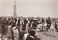 Het muziekkorps van de Spahis komen voorbij het monument der Zeelieden op het Zeeheldenplein tijdens het bezoek van deze Noord Afrikaanse ruiters aan Oostende.
