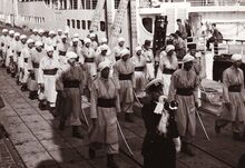 Een afdeling van de Spahis (Noord Afrikaanse ruiters in dienst van het Frans leger) op de NatiΓ«nkaai bij een aangemeerde ferry.