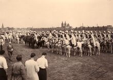 In de periode 19-23 juli was er een internationaal "Concours Hippique", met een feest van de Spahis. Een afdeling Noord Afrikaanse ruiters, Spahis, opgesteld op de Wellingtonrenbaan tijdens hun bezoek aan de stad. Op de achergrond de werkhuizen van de N.M.V.B. (Buurtspoorwegen) aan de Nieuwpoortse steenwegΒ en de Heilig Hart kerk.