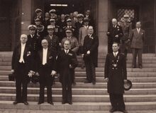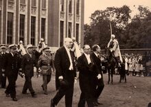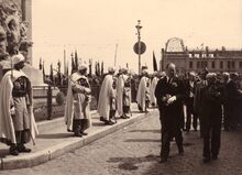 Burgemeester Hendrik SERRUYS (centraal),Β stadssecretaris Michel SURMONT (links vooraan) en schepen Louis VANDENDRIESSCHE (rechts vooraan) verlaten het dd. stadhuis (huidig Gerechtsgebouw) na een ontvangst van een delegatie Spahis (Noord Afrikaanse ruiters). De Belgische Marineofficier achteraan links is Korvetkapitein PETITJEAN
