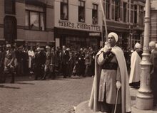 Een optocht van Franse en Belgische militairenΒ enΒ andere notabelen tijdens een bezoek van de spahis (Noord Afrikaanse ruiters) aan de stad. Hier aan de Jozef II-straat en hetΒ Sint Petrus en Paulusplein, van of naar het Te Deum in de Sint Petrus en Pauluskerk op onze nationale feestdag. De militair met witte boord (juist naast de Spahi op de voorgrond) is legeraalmoezenier Jean MOULAERT.