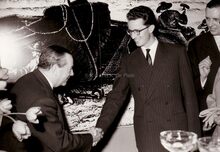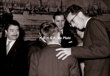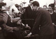 Koning Boudewijn drukt een onbekende de hand tijdens een bezoek aan Oostende,rechts staat burgemeester Jan PIERS.