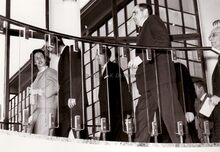 Formaat : 13 x 18 cm. - Plechtige ontvangst op het Stadhuis van Koning Boudewijn en Koningin Fabiola Β waar zij de uitreiking van de premies aan scheepsjongens en reders bijwoonden.Β Centraal, burgemeester Jan PiersΒ en links, schepen Roger De Kinder
