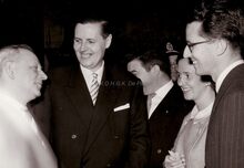 Formaat : 13 x 18 cm. - Koning Boudewijn en Koningin Fabiola in gesprek met Prosper Vandenberghe (onder voorbehoud). Centraal, burgemeester Jan PiersΒ en schepen Roger De Kinder