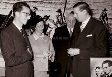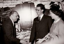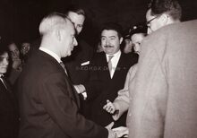 Formaat : 13 x 18 cm. - Op het einde van hun bezoek woonden Koning Boudewijn en Koningin Fabiola de uitreiking bij van de premies aan scheepsjongens en reders in het Stadhuis. Hier in gesprek met Prosper Vandenberghe (onder voorbehoud). In het midden, burgemeester Jan Piers