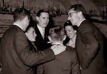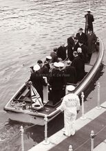Formaat : 18 x 13 cm. -Β Koning Boudewijn en Koningin Fabiola met burgemeester Jan Piers enΒ het schepencollegeΒ aan boord van een sloep van de Zeemacht, varen vanaf de Royal North Sea Yacht ClubΒ naar hun huweluksbootje de O.1 "Fabiola"