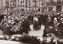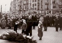 Formaat : 13 x 18 cm. - Koning Boudewijn en KoninginΒ brengen een bloemenhulde aan het Monument der Zeelieden op het Zeeheldenplein. Links van hen, burgemeester Jan Piers. Leden van de folklorevereniging "De Vismijnvrienden" dragen de bloemen en kransen