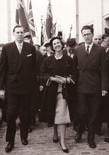 Koning Boudewijn en koningin Fabiola met burgemeester Jan PIERS op een plechtigheid tijdens een koninklijk bezoek aan de stad.