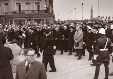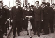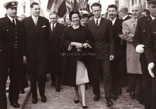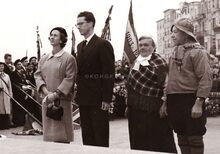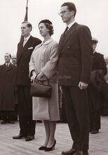 Formaat : 13 x 18 cm. - Koning Boudewijn en Koningin Fabiola op weg naar de Royal North Sea Yacht Club na de bloemenhulde aan het Monument der Zeelieden. Links, burgemeester Jan Piers.Β Achter hen burggraaf Edmond Poullet, deΒ vleugeladjudant van de koning en later vice-admiraal van de Zeemacht.