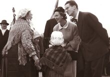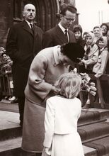 Formaat : 18 x 13 cm. - Koningin Fabiola krijgt een ruiker bloemen na het bijwonen van de vissersmis in de Sint Petrus- en Pauluskerk.Β Achter haar Koning Boudewijn en Charles HΓ©ger, minister van landbouw.