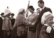Formaat : 13 x 18 cm. - Koning Boudewijn en Koningin Fabiola in gesprek met leden van de folkloristische vereniging "de Vismijnvrienden" na de plechtigheid aan het Monument der Zeelieden.