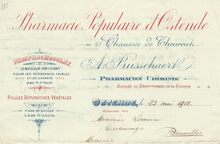 "De apotheek was gelegenΒ derdeΒ huis van de Muscarstraat. HetΒ had eenΒ brede gevelΒ met inrijpoort en eenΒ etalage met ingang. Met hetΒ tweedeΒ huis van dezelfde hoek was de schoenwinkel Degrijse" (Etienne Blommaert)