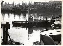 Formaat : 13 x 18 cm. - 18 x 13. - Het visserijdok met de vismijn in opbouw en vaartuigen in het dok