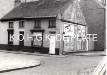 Formaat : 8 x 12,5 cm. - Hoek Metselaarsstraat-Timmermansstraat. Vermoedelijk het restant van een langere rij arbeiderswoningen uit eind 19de eeuw. Op de zijmuur van nr. 70 zien we 4 reclamepanelen