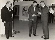 Formaat : 17 x 22,5 cm. - De vernissage ging door op 7 september 1963 in de inkomhal van het Kursaal. Eerste minister Théo Lefèvre, met traditionele sigaar, schepen Roger De Kinder en Maurice Boel. De kunstenaar ontving ook de stadsmedaille.