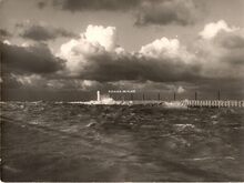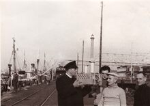 Formaat :Β 18 x 13 cm. - Een aalmoezenier in gezelschap van enkele vissers op de Hendrik Baelskaai. Links, vissersvaartuigen aangemeerd in het Visserijdok. Op het einde, de vierde vuurtoren "Lande Nelle".