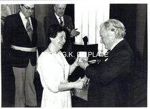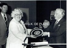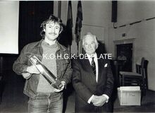 Formaat : 13 x 18 cm. - Eerste uitreiking van de "Octaaf Trofee" in het Feest- en Cultuurpaleis 1986. Eerste laureaat Carl Leroy (KVGO) hier samen met Octaaf Defoor, schenker van de trofee.