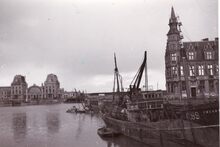 FotoΒ : 9 x 6 CM. - Β Op de achtergrondΒ hetΒ Zeestation. De O.89 "Freddy" aangemeerd in het eerste handelsdok nabij het politiebureau op de wijk Hazegras
