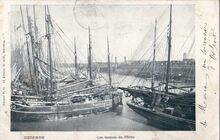 Formaat : 18 x 24 cm. - Het Visserijdok met talrijke vissersvaartuigen langs de Hendrik Baelskaai. Met de visverwerkende bedrijven Les Frigorifères du Littoral en Brunet en Co.