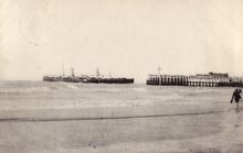 Een pakketboot van de Oostende Dover lijn nadert de havengeul. We zien een gedeelte van het Weststaketsel vanaf het Groot Strand
