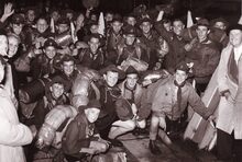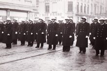 Formaat : 13 x 18 cm. - Een groep politieagenten uit Londen op de Pakketbotenkaai bij hun aankomst te Oostende. Zij waren hier op uitnodiging van hun Oostendse collega's.