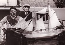 Formaat : 13 x 18 cm. - Maquette van de D.51, een Ijslandvaarder uit Duinkerke met de trotse vervaardiger.