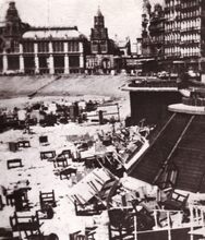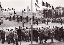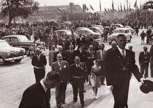Formaat : 13x 18 cm. - Opening van de nieuw aangelegde Autostrade. De notabelen gaan naar het dienstdoend stadhuis (huidig Gerechtshof). Centraal, burgemeester Adolf Van Glabbeke en achter hem schepen Jan Piers. Op de tweede rij, schepen Kamiel Dehouck met naast hem Michel Surmont, stadssecretaris.