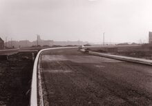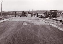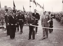 Formaat : 13 x 18 cm. - Opening van de nieuw aangelegde Autostrade aan het kruispunt met de Alfons Pieters- en Vindictivelaan. Centraal burgemeester Adolf Van Glabbeke met een minister. Erachter van links naar rechts schepenen Kamiel Ddehouck, Maurice Qaughebeur, stadssecretaris Michel Surmont en schepen Jan Piers. Uiterst links stadsdeurwachter Henri Lanoye.