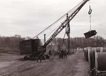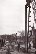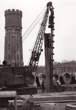 Formaat : 18 x 13 cm. - Inheien van damplanken nabij de oude watertoren.