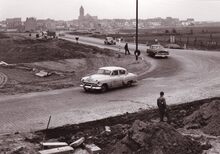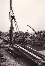 Aanleggen van de Autostrade, inheien van damplanken door de firma Socol uit Brussel.Op de achtergrond links de oude watertoren en rechts het stedelijk laboratorium. De Verenigde Natieslaan (gemeenteraad 27/04/1956). Gedeelte tussen het President Kennedyplein en het Vuurkruisenplein. Aangelegd op de bedding van de vroegere spoorwegverbinding Oostende-Brugge. Bij de aanleg heette deze nieuwe weg officieus de Verbindingslaan of ook nog de Indringingslaan (gemeenteblad 1954, p.635) (Straatnamen van Oostende van A tot Z / Daniël Deschacht)