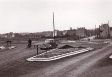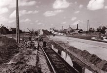 Formaat : 13 x 18 cm. - Aanleg van de Elisabethlaan nabij de Sint Janskerk. Aangelegd midden de jaren 1950 naar aanleiding van het recht doortrekken naar de Kennedyrotonde, dit in het kader van de aansluiting naar de autosnelweg Brussel-Oostende . Op de achtergrond rechts, de Tarwestraat.