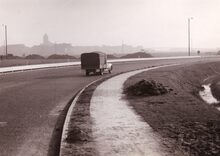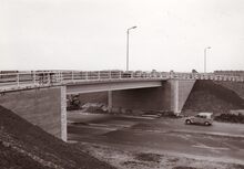 Formaat : 13 x 18 cm. - Brug over de autosnelweg A 10 (Brussel - Oostende). De aanleg van de autosnelweg Jabbeke - Oostende begin de jaren vijftig sneed de Konterdamwijk af van de rest van Stene. Met de bouw van een noodbrug (Baileybrug) werd hieraan verholpen. In 1962 werd de brug vervangen door een vaste constructie. De brug maakt deel uit van de Oprit. De straat begint aan de Gistelsesteenweg en eindigt aan de Vanderstichelenstraat. (Straatnamen van A tot Z / D. Deschacht. 1998. p.119)