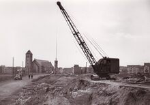 Formaat : 13 x 18 cm. - Aanleg van de Elisabethlaan nabij de Sint Janskerk. De kraan staat op het einde van de Soldatenbergs.