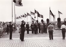 Formaat : 13 x 18 cm. - Burgemeester Adolf Van Glabbeke knipt het lint door. Links, Alois Dennekin (feestbestuurder). Rechts, de heer Willems, kabinetshoofd van de Minister van Openbare Werken. Op de tweede rij, van rechts naar links, de schepenen Kamiel Dehouck, Jan Piers en Maurice Quaghebeur sr.