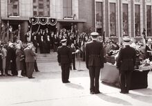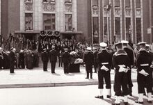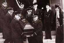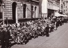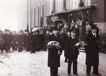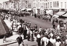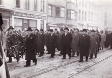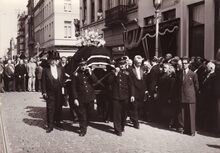 Formaat : 13 x 18 cm. - De lijkkist van burgemeester Henri Serruys op de VindictivelaanΒ rechtover de plaats van het stadhuis