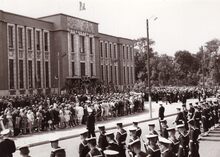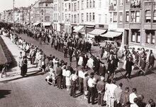 Formaat : 13 x 18 cm. - De begrafenisstoet vanΒ Ernest Van Glabbeke, gewezen schepen van openbaar onderwijs, op de Alfons Pieterslaan. De Oostendse schoolkinderen warenΒ in groot aantal aanwezig.