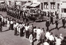 Formaat : 13 x 18 cm. - De begrafenisstoet vanΒ Ernest Van Glabbeke, gewezen schepen van openbaar onderwijs, op de Alfons Pieterslaan,aan de rijkswachtkazerne.